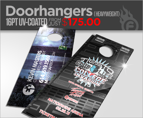 Doorhangers (16pt):Every day your potential customers can choose from dozens of radio stations, hundreds of TV channels, and millions of web pages.. But they only have ONE front door! Whether you run a pizza shop, dry cleaners, home improvement company, or practically any other business that deals with the public, doorhangers are a proven way to market your services directly to your customer! Out 16pt UV Ultra Gloss provide ultimate durability and DEMAND attention!
