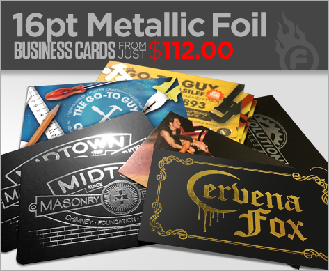 16 Pt Metallic Foil Business Cards:OK... now we're getting REALLLY fancy! When you need your Business Cards to carry some BLING, you might be looking for our 16pt Premium BC's with added Metallic Foil! Whether you want Silver or Gold Metallic overprint or full-color Liqui-Foil overlay which allows the full-color design beneath to show thru, our Metallic Foil cards will DEMAND attention wherever they drop!